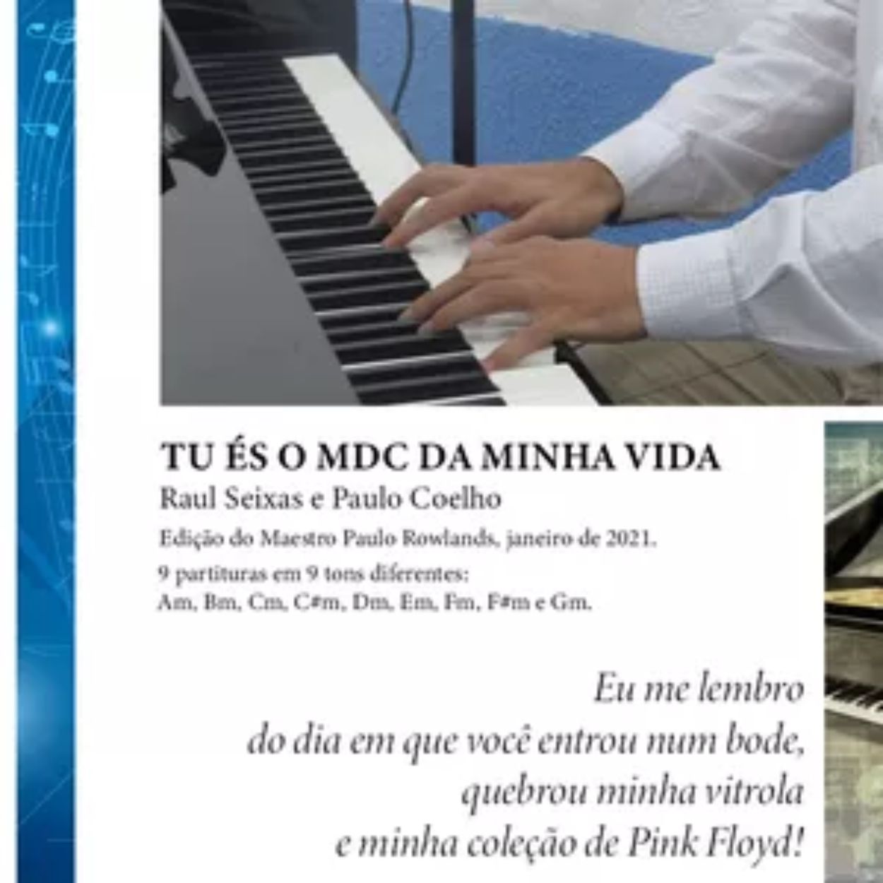 Este infoproduto oferece 9 partituras da canção TU ÉS O MDC DA MINHA VIDA, de Raul Seixas e Paulo Coelho, nos tons Am, Bm, Cm, C#m, Dm, Em, Fm, F#m e Gm, para você escolher a que melhor combina com a sua voz.